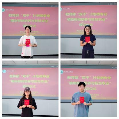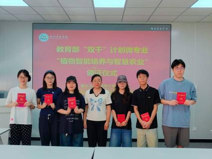 近日,我院“植物智能培养与智慧农业”微专业成功入选教育部“双千计划”微专业建设,这也是学院首个建设完成的校级微专业。9月23日,学院举行了简短的颁证仪式,来自生物技术的同学们获得教育部微专业学习认证证书和学校微专业的“双证书”,成为学院跨学科复合型人才培养的先行者。