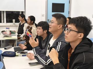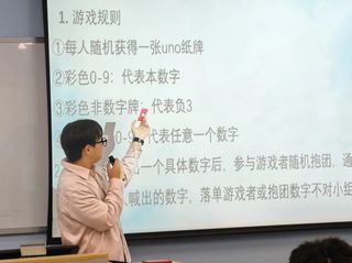 活动伊始,主持人冯瑜阳做了简要开场白。在详细介绍了规则后,每人抽一张扑克牌,主持人喊出目标数后,需快速找到卡牌数字相加匹配的同伴抱团。一开始,大家还在犹豫“要不要主动搭话”,但当“6”的指令响起,有人急着喊“我是2!缺个4”。有人主动拉上身边落单的同学——原本分散的座位被打乱。大家以“找队友”为目标,活跃于教室的各个角落,顷刻间,“和陌生人说话”的压力烟消云散。