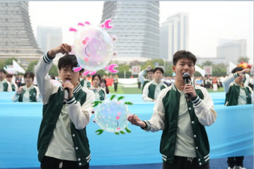 随着亚运会主题曲《等你来》响起,四位同学激情开唱。而活力满满的舞蹈将现场氛围推至高峰。蓝布如波浪般起伏,象征着水产养殖学子心中的广阔海洋梦。各式气球随风飘扬,承载着青春的梦想与希望。在歌声与律动中,“新农人”们以最饱满的热情呼应亚运精神,展现“智慧渔业,强国有我”的信念。